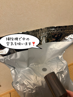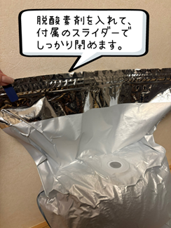 お米を袋ごとアルミ保存袋に入れ、掃除機で中の空気を吸い出します。さらに、付属の脱酸素剤を入れてスライダーでしっかり密閉。さらに掃除機で中の空気を吸いだします。